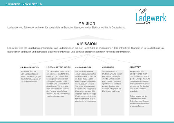 Ladewerk wird als unabhängiger Betreiber von Ladestationen bis zum Jahr 2021 an mindestens 1.000 attraktiven Standorten in Deutschland Ladestationen aufbauen und betreiben. Ladewerk entwickelt und betreibt Branchenlösungen für die Elektromobilität.
